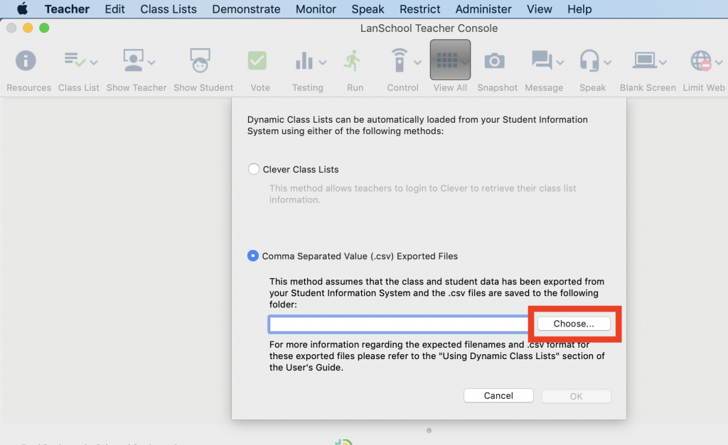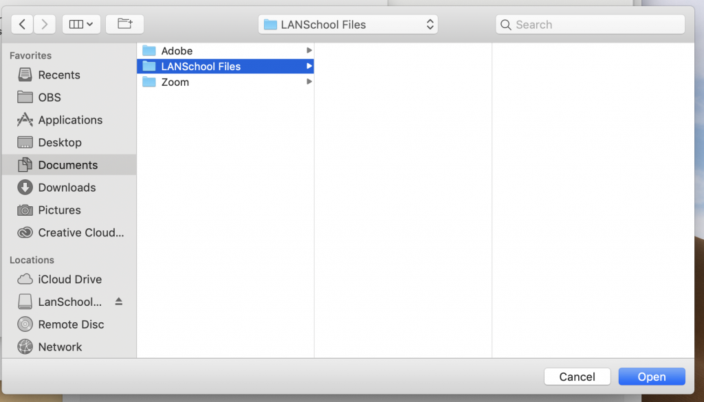 4. Select Choose. It will open up to the Documents folder. From there select the folder called LANSchool Files, and then click open