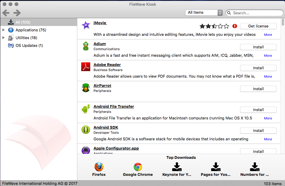 -You should now see the filewave kiosk, from here you can browse the available software and choose install on anything that interests you: