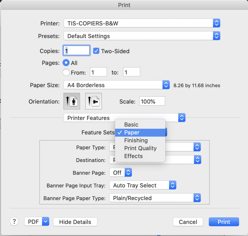 Choose either TIS-COPIERS-COLOR, or TIS-COPIERS-B&W depending on whether you want to print color or grayscale. Then Choose the layout dropdown: