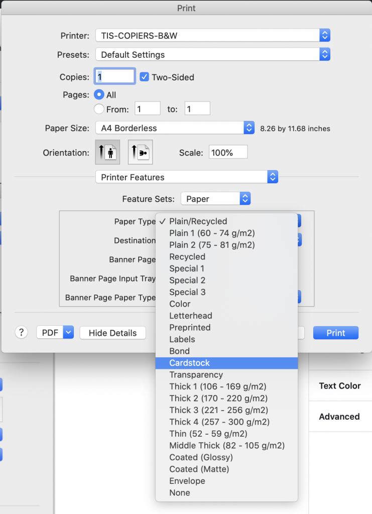 Under “Paper Type:” Choose the type of paper that corresponds closest to the paper you are trying to print from. If you are unsure, choose cardstock as this will feed the paper the slowest of the options: