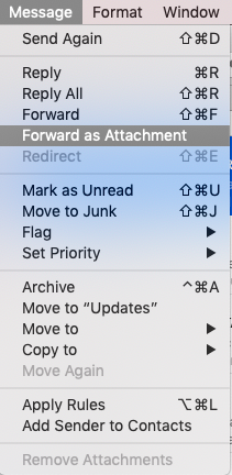 – Select the message that made it through the SPAM filter and choose Message –> Forward as attachment: