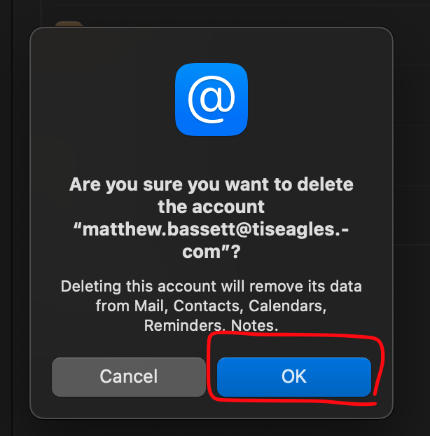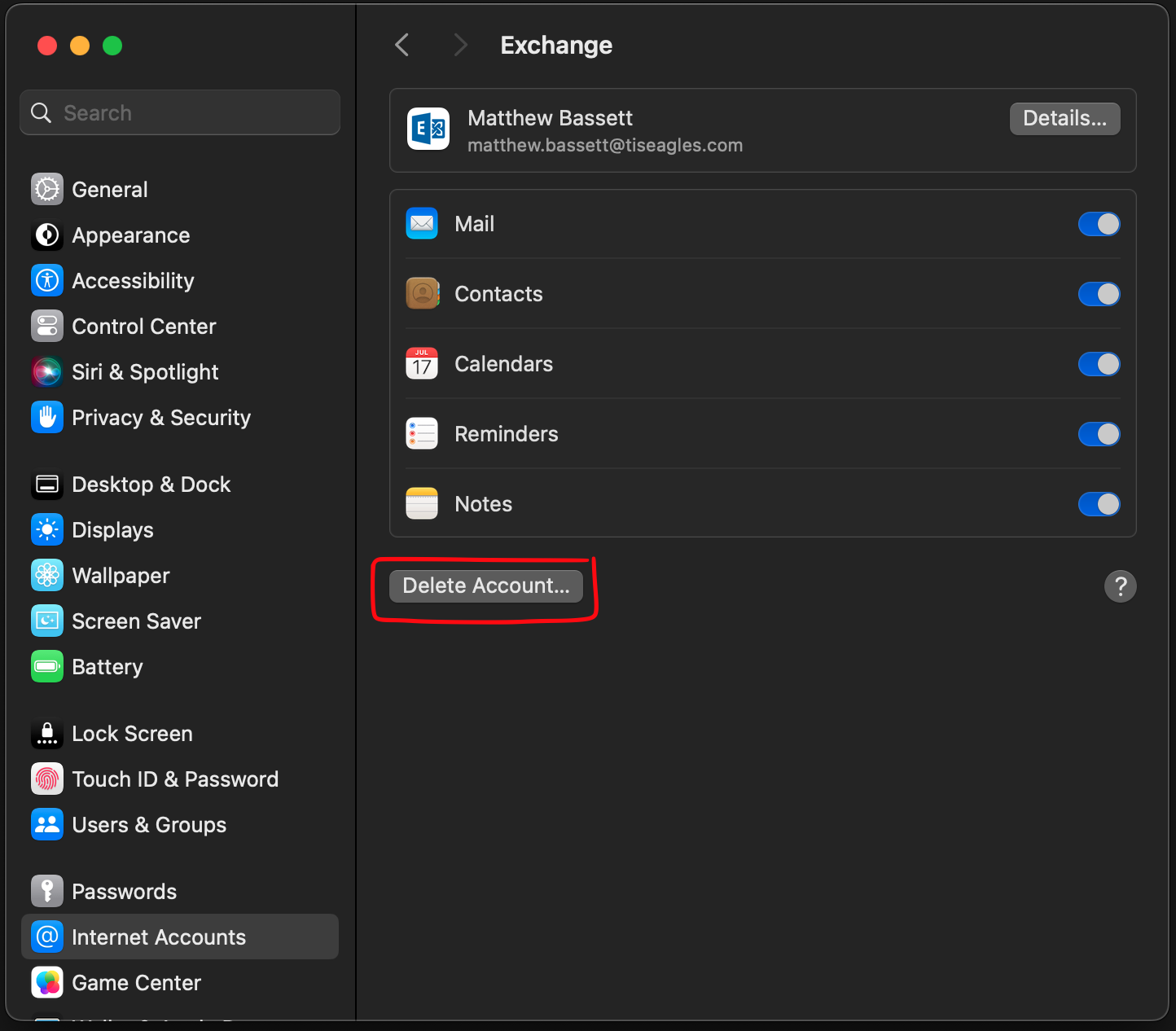 Find your email account in the list and select it, then choose “Delete Account” from the bottom of the page: