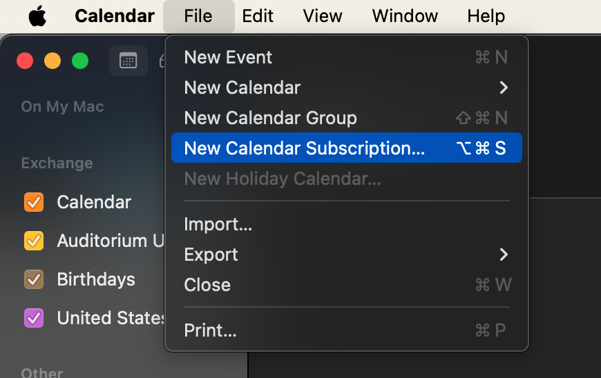 Click on “File” –> “New Calendar Subscription”: